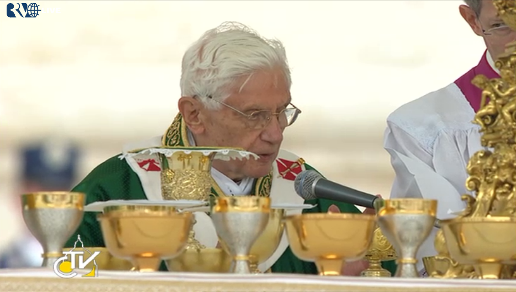 Pozdrawiam serdecznie Polaków, uczestników liturgii otwarcia Synodu Biskupów. Proszę was o modlitewne wsparcie prac synodalnych, których przedmiotem będzie nowa ewangelizacja. Jej protagonistami i pionierami są święci. Ich wzorem ukazujmy innym piękno Ewangelii, głębię wiary i moc sakramentów, a szczególnie Eucharystii. Zawierzając dzieło Synodu Dziewicy Maryi, Królowej Różańca Świętego, z serca wam błogosławię.