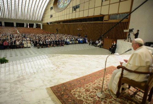 (ACI/EWTN Noticias).- El Papa Francisco recibió esta mañana a más de 8 mil alumnos y exalumnos de colegios jesuitas de Italia y Albania en el Aula Pablo VI del Vaticano. Con el discurso que había preparado en mano y en medio de un ambiente de fiesta, el Santo Padre decidió no leerlo, darlo por leído y entregarlo luego al encargado de prensa de la Santa Sede, para poder así responder a las preguntas que los jóvenes quisieran formularle, lo que generó la alegría de los presentes.