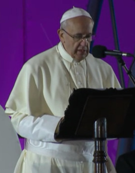 3. Pero la Cruz invita también a dejarnos contagiar por este amor, nos enseña así a mirar siempre al otro con misericordia y amor, sobre todo a quien sufre, a quien tiene necesidad de ayuda, a quien espera una palabra, un gesto. La Cruz nos invita a salir de nosotros mismos para ir al encuentro de ellos y tenderles la mano. Muchos rostros, lo hemos visto en el Viacrucis, muchos rostros acompañaron a Jesús en el camino al Calvario: Pilato, el Cireneo, María, las mujeres… Yo te pregunto hoy a vos: Vos, ¿como quien querés ser. Querés ser como Pilato, que no tiene la valentía de ir a contracorriente, para salvar la vida de Jesús, y se lava las manos? Decidme: Vos, sos de los que se lavan las manos, se hacen los distraídos y miran para otro lado, o sos como el Cireneo, que ayuda a Jesús a llevar aquel madero pesado, como María y las otras mujeres, que no tienen miedo de acompañar a Jesús hasta el final, con amor, con ternura. Y vos ¿como cuál de ellos querés ser? ¿Como Pilato, como el Cireneo, como María? Jesús te está mirando ahora y te dice: ¿me querés ayudar a llevar la Cruz? Hermano y hermana, con toda tu fuerza de joven ¿qué le contestás?