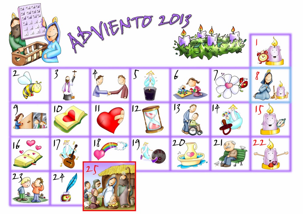 Pensando en los niños, se me ha ocurrido este calendario de Adviento, con dibus de nuestro querido Patxi Velasco Fano. El calendario lo ha montado Fidel Valle Alcázar, que siempre me echa una y dos manos con todos estos proyectos, ya que además de fotógrafo es un artista con el photoshop. Se le puede entregar fotocopiado a los niños. Cosa que, ciertamente, es posible. Y decirles que ese papelito va a ser su guía y acompañante para acoger y recibir a Jesús, que muy pronto, va a llegar a sus vidas a través de la Navidad.