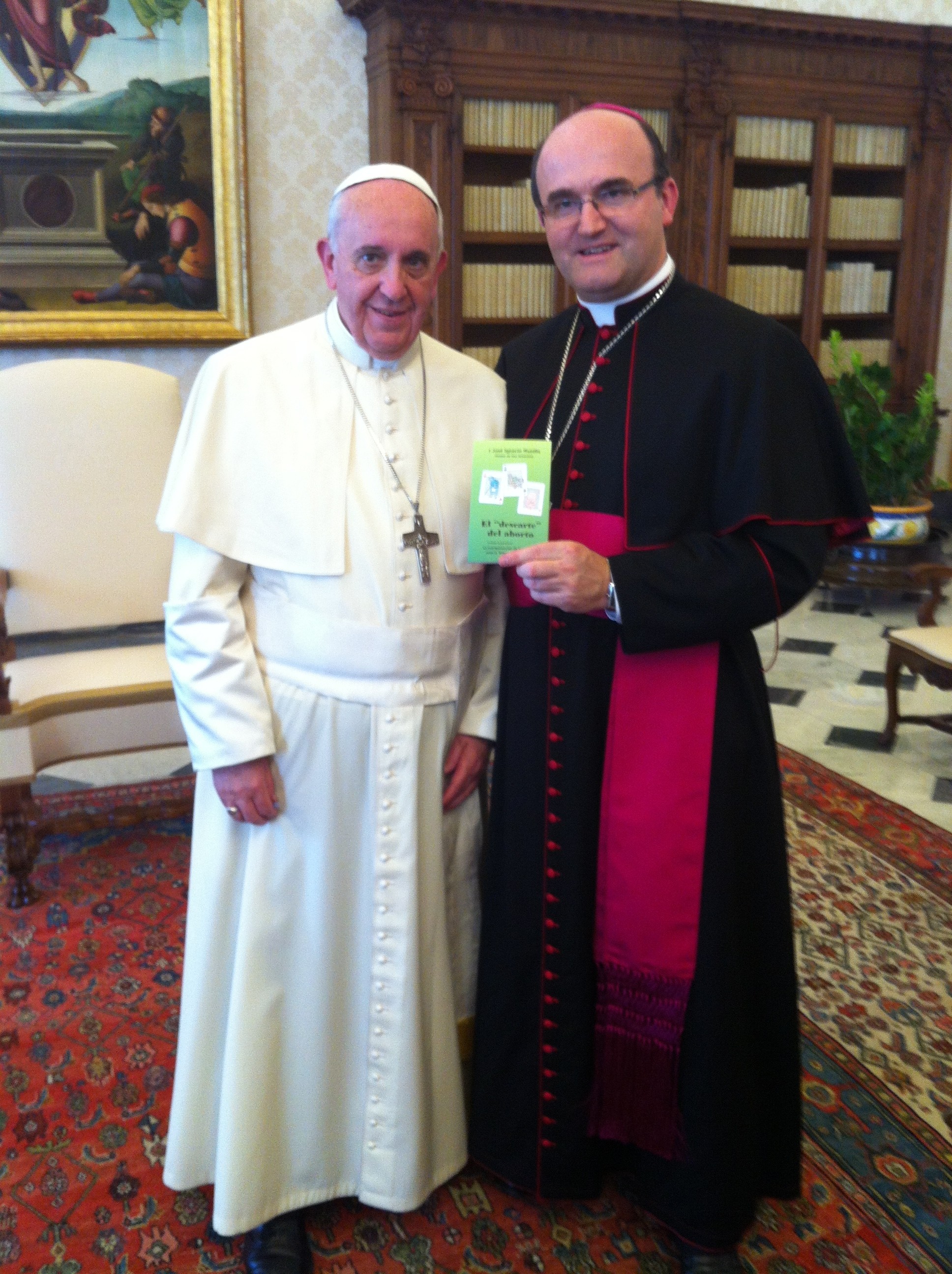 Del Papa Francisco recuerda el párrafo 213 de Evangelii Gaudium, que menciona a «los niños por nacer, que son los más indefensos e inocentes de todos, a quienes hoy se les quiere negar su dignidad humana en orden a hacer con ellos lo que se quiera,quitándoles la vida y promoviendo legislaciones para que nadie pueda impedirlo. Frecuentemente, para ridiculizar alegremente la defensa que la Iglesia hace de sus vidas, se procura presentar su postura como algo ideológico, oscurantista y conservador. Sin embargo, esta defensa de la vida por nacer está íntimamente ligada a la defensa de cualquier derecho humano. Supone la convicción de que un ser humano es siempre sagrado e inviolable, en cualquier situación y en cada etapa de su desarrollo».