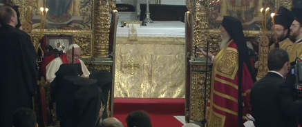 Vuestra venida aquí, por primera vez desde la reciente elevación de Vuestra Santidad al Trono de la “primacía del amor”, constituye una continuación a análogas visitas de vuestros venerables predecesores Pablo VI, Juan Pablo II y Benedicto XVI, testimoniando vuestra voluntad como también la de la Santísima Iglesia de Roma, de continuar el firme camino fraternal con nuestra Iglesia Ortodoxa para el restablecimiento de la plena comunión entre nuestras Iglesias. Saludamos, por eso, con mucha satisfacción y estima la venida aquí de Vuestra Santidad, como un evento histórico y lleno de buenos auspicios para el futuro.