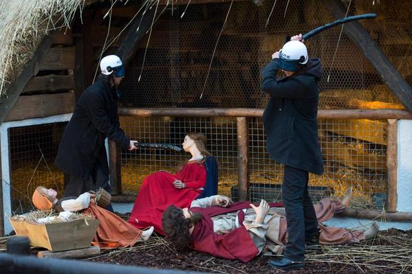 4 de diciembre de 2014.- Activistas de Femen han atacado con porras un Belén instalado en el centro de la Gran Plaza de Bruselas. Dos mujeres del grupo radical totalitario saltaron la pequeña valla metálica que rodea el Belén y la emprendieron a golpes con las imágenes de María y San José. Al mismo tiempo exhibieron una pancarta con una frase ofensiva que se supone que es una protesta contra las medidas de austeridad presupuestaria del gobierno belga.