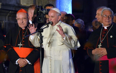 Vengo a Quito como peregrino, para compartir con ustedes la alegría de evangelizar. Salí del Vaticano saludando la imagen de santa Mariana de Jesús, que desde el ábside de la Basílica de San Pedro vela el camino que el Papa recorre tantas veces. A ella encomendé también el fruto de este viaje, pidiéndole que todos nosotros pudiésemos aprender de su ejemplo. Su sacrificio y su heroica virtud se representan con una azucena. Sin embargo, en la imagen en San Pedro, lleva todo un ramo de flores, porque junto a la suya presenta al Señor, en el corazón de la Iglesia, las de todos ustedes, las de todo Ecuador.