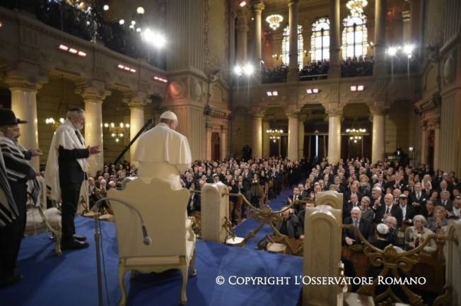 El Santo Padre ha entrado en el Templo mayor acompañado del rabino jefe de Roma, Riccardo Di Segni. Dentro, les esperaban la comunidad romana y representantes de varias comunidades judías de Europa. El Pontífice ha iniciado su discurso dando las gracias en hebreo: Todà rabbà! Asimismo ha expresado su “saludo fraterno de paz de esta Iglesia y de toda la Iglesia católica”.
