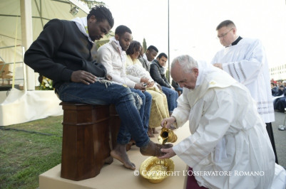 24 de marzo de 2016.- El Santo Padre Francisco celebró este Jueves Santo por la tarde la Misa in Coena Domini, en un centro de recepción de inmigrantes en las afueras de Roma, donde se encuentran 892 huespedes de 26 nacionalidades, de los cuales 554 son musulmanes, 337 cristianos y 2 hindúes.