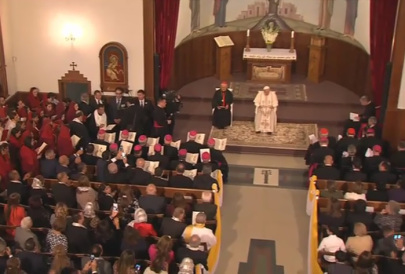 A su llegada, a las 18.15 horas, ha sido acogido por el Patriarca de Babilonia de los Caldeos, S.B. Louis Raphaël Sako, y por el párroco a la entrada de la iglesia. Después, el Santo Padre ha ido en procesión hacia la Capilla del Santísimo con fieles de la diáspora siro-caldea.