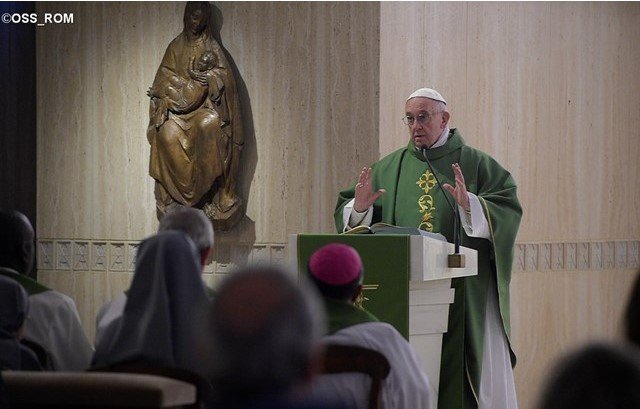 Jesús dice luego a los discípulos: «Vendrán días en que desearéis ver un solo día del Hijo del hombre, y no lo veréis» (v. 22). Es el tiempo de la normalidad de la Iglesia escondida, silenciosa, sin ruido: “Pues a mí me gustaría algo que se vea”. «Entonces se os dirá: “Está aquí” o “Está allí”; no vayáis» (v. 23). El Señor nos ayuda a no caer en la tentación de la seducción: “Nos gustaría que la Iglesia se viese más; ¿qué podemos hacer para que se vea?”. Con esa actitud se suele caer en un Iglesia de actos incapaz de crecer en silencio. Y acaba en una sucesión de espectáculos. Sin embargo, la Iglesia crece por testimonio, por oración, por atracción del Espíritu que está dentro de esos actos, que ayudan: ¡uno, dos o tres, ayudan! El crecimiento propio de la Iglesia, el que da fruto, es en silencio, con las buenas obras y la celebración de la Pascua del Señor, la alabanza a Dios.