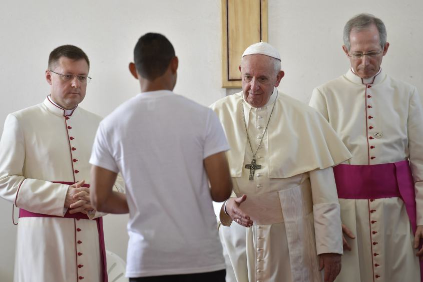 En cambio, todo el evangelio está marcado por esta otra mirada que no es nada más y nada menos que la que nace del corazón de Dios. Dios nunca te va a echar. Dios no echa a nadie. Dios te dice: vení, Dios te busca y te abraza. El Señor quiere hacer fiesta cuando ve a sus hijos que retornan a casa (cf. Lc 15,11-32). Así lo testimonió Jesús manifestando hasta el extremo el amor misericordioso del Padre. Tenemos Padre, hijitos, tenemos Padre. Me gustó esa confesión tuya: “Yo tengo Padre”. Un amor que no tiene tiempo para murmurar, sino que busca romper el círculo de la crítica superflua e indiferente, neutra e imparcial y asume la complejidad de la vida y de cada situación; un amor que inaugura una dinámica capaz de ofrecer caminos y oportunidades de integración y transformación, de sanación y de perdón, caminos de salvación. Comiendo con publicanos y pecadores, Jesús rompe la lógica que separa,excluye, aísla y divide falsamente entre “buenos y malos”. Y no lo hace por decreto o con buenasintenciones, tampoco con voluntarismos o sentimentalismo, lo hace creando vínculos capaces de posibilitar nuevos procesos; apostando y celebrando cada paso posible.