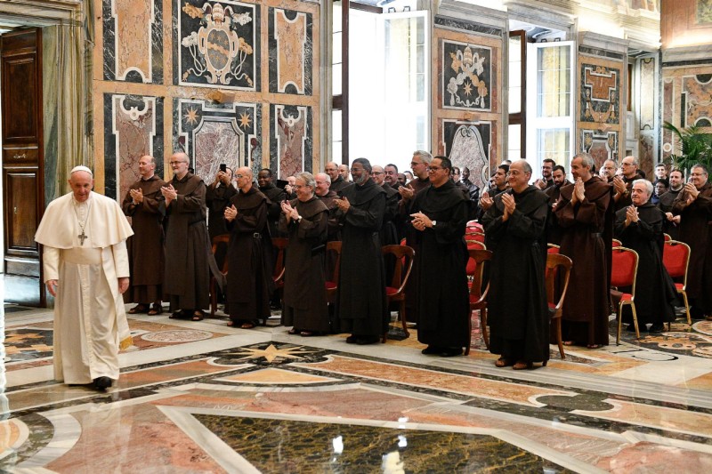 Partiendo de la amistad con Dios y del estilo de la fraternidad, también estáis llamados a repensar vuestra misión, con creatividad y un decidido impulso apostólico, prestando mucha atención al mundo de hoy. Quisiera insistir en lo que ya he mencionado anteriormente: esta renovación de vuestra misión está inseparablemente ligada a la fidelidad a vuestra vocación contemplativa: buscad vosotros la forma de hacerlo, pero está ligada.No debéis imitar la misión de otros carismas, sino ser fieles al vuestro, para dar al mundo lo que el Señor os ha dado para el bien de todos, es decir, el agua viva de la contemplación. La contemplación no es una evasión de la realidad, un encierro en un oasis protegido, sino una apertura del corazón y de la vida a la fuerza que verdaderamente transforma el mundo, es decir, el amor de Dios. Fue en una prolongada oración solitaria donde Jesús recibió el impulso para ” partir ” su vida cada día entre la gente. Y lo mismo ocurre con los hombres y mujeres santos: la generosidad y el coraje de su apostolado son fruto de su profunda unión con Dios.