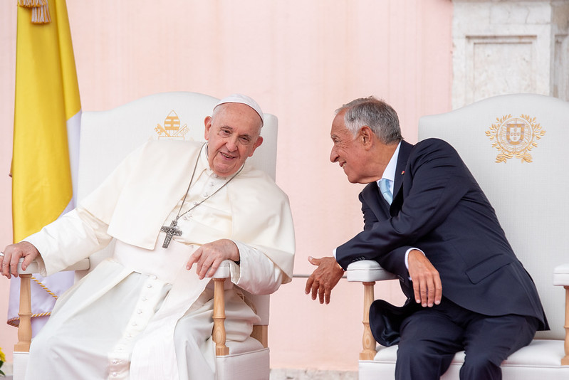 Saludo cordialmente a todos ustedes y agradezco al señor Presidente la bienvenida y las cordiales palabras que me ha dirigido. Me siento contento de estar en Lisboa, ciudad de encuentro que abraza diferentes pueblos y culturas, y que en estos días se vuelve todavía más universal; se transforma, de alguna manera, en la capital del mundo. Esto se ajusta bien a su carácter multiétnico y multicultural ―pienso en el barrio Mouraria, donde viven en armonía personas provenientes de más de sesenta países―, y descubre el rasgo cosmopolita de Portugal, que ahonda sus raíces en el deseo de abrirse al mundo y explorarlo, navegando hacia horizontes nuevos y más amplios.