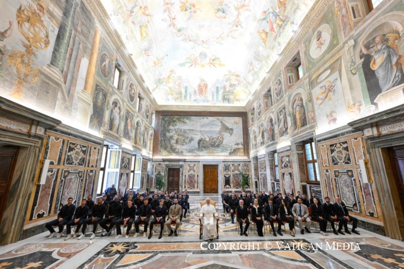 Por eso, me alegra mucho darles la bienvenida ahora, para destacar este aspecto de su éxito, que considero el más importante. Y diría que también lo es desde el punto de vista social. Sabemos lo popular que es el fútbol en Italia y prácticamente en todo el mundo. Y, por lo tanto, también desde este punto de vista, me parece que el valor social de un acontecimiento como este, que va más allá del mero aspecto técnico-deportivo, es el ejemplo de un equipo —en sentido amplio— que trabaja unido, en el que el talento de cada uno se pone al servicio del conjunto.